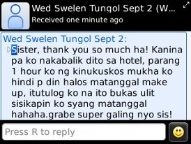 And she never failed to give me a feedback on her wedding night. 🙂 This is a screen capture from my Blackberry phone 🙂